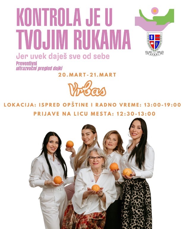 Ултразвучни прегледи у акцији под називом "Контрола је у твојим рукама - Јер увек дајеш све од себе", вршиће се у мобилној амбуланти на Тргу Николе Пашића, у петак у суботу од 13.00 до 19.00 часова. Пријаве за преглед могуће су на лицу места, од 12.30 до 13.00 часова.